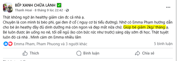 Chuyện là con mình bị béo phì, gai đen ở cổ ( nguy cơ bị tiểu đường). Nhờ có Emma Phạm hướng dẫn cho bé ăn heathy đầy đủ dinh dưỡng mà còn ngon và đẹp mắt nữa chứ. Giúp bé giảm 2kg/ tháng ạ. Bé luôn được ăn uống no nê, tối dễ ngủ (ko còn bức rức như trước) sáng dậy sớm đi học. Thật tuyệt luôn đó cá nhà . Mình cám ơn Emma nhiều lắm "