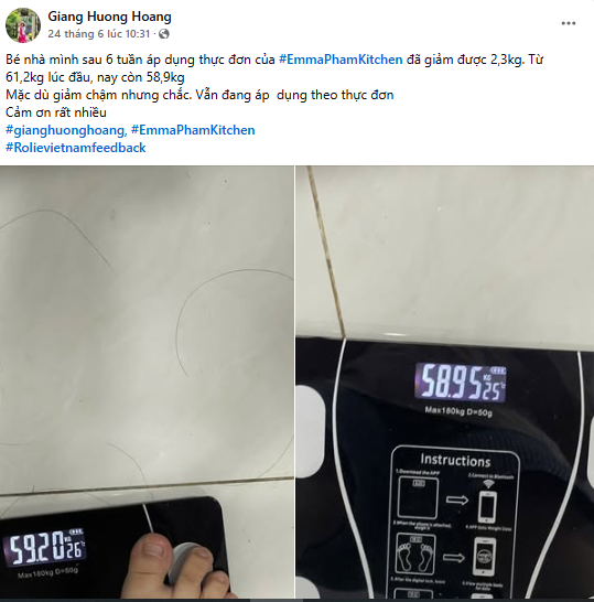 " Bé nhà mình sau 6 tuần áp dụng thực đơn của #EmmaPhamKitchen đã giảm được 2,3kg. Từ 61,2kg lúc đầu, nay còn 58,9kg