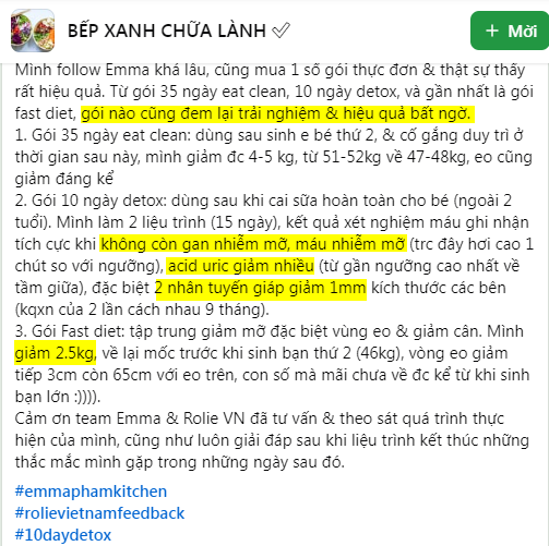 Mình follow Emma khá lâu, cũng mua 1 số gói thực đơn & thật sự thấy rất hiệu quả. Từ gói 35 ngày eat clean, 10 ngày detox, và gần nhất là gói fast diet, gói nào cũng đem lại trải nghiệm & hiệu quả bất ngờ.