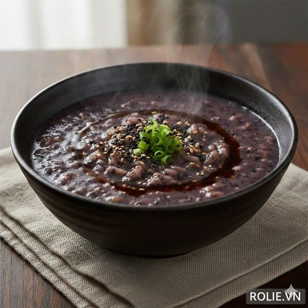 Nấu cháo gạo lứt nhừ, thêm 1–2 thìa mè đen rang xay khi cháo chín.