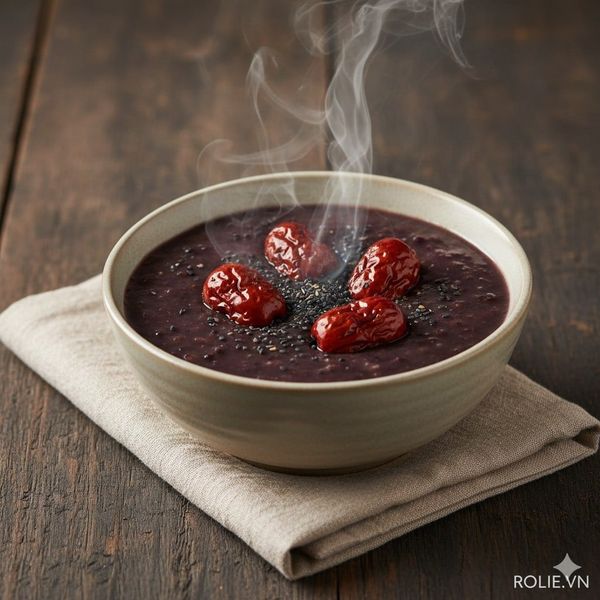 Nấu nhừ đậu đen, thêm gạo lứt, cuối cùng cho mè đen xay + 2–3 quả táo đỏ.